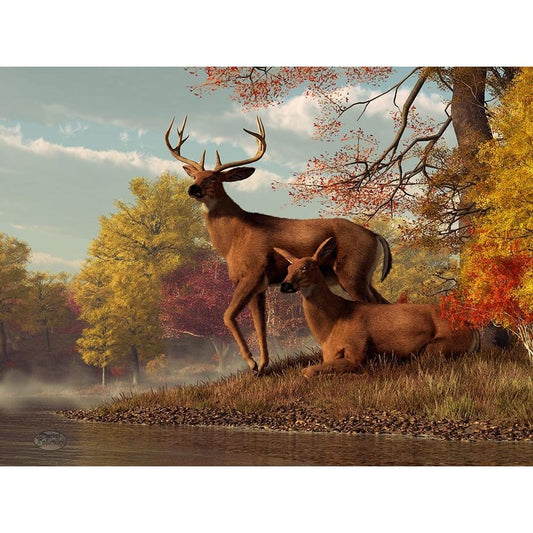 Deer On An Autumn Lakeshore Black Modern Wood Framed Art Print by Eskridge, Daniel