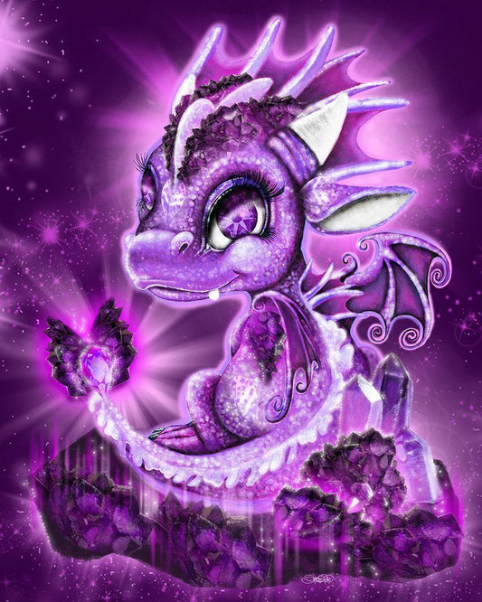 February - Amethyst - Birthstone Lil Dragonz White Modern Wood Framed Art Print with Double Matting by Sheena Pike Art
