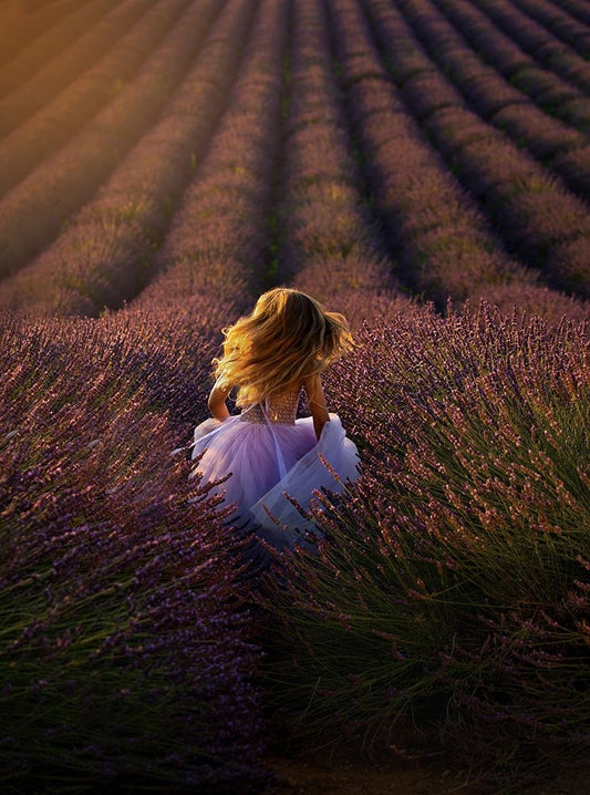 A Girl Running Towards The Flower Field White Modern Wood Framed Art Print with Double Matting by Hu, Mei