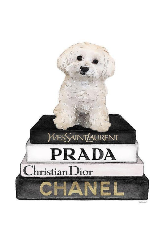 Bichon Frise Bookstack White Modern Wood Framed Art Print with Double Matting by Amanda Greenwood