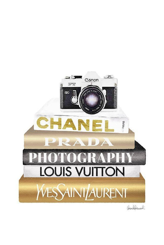 Camera Bookstack White Modern Wood Framed Art Print with Double Matting by Amanda Greenwood