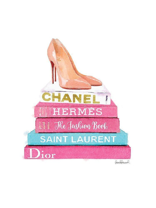 Pink Bookstack with shoes White Modern Wood Framed Art Print with Double Matting by Greenwood, Amanda