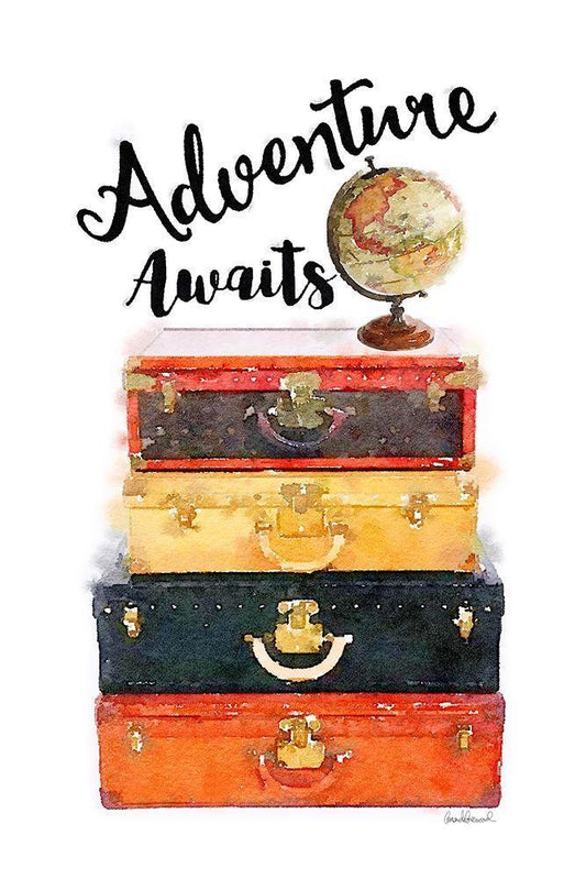 Adventure Awaits Luggage White Modern Wood Framed Art Print with Double Matting by Greenwood, Amanda