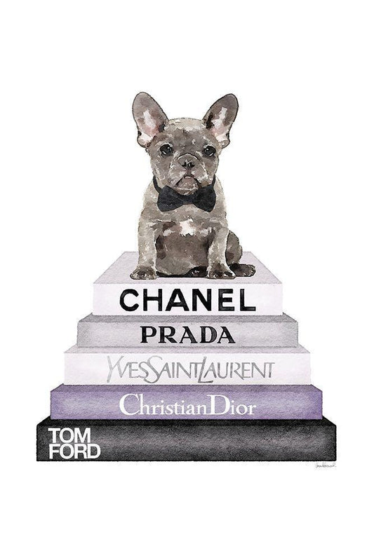 Purple Frenchie Bookstack White Modern Wood Framed Art Print with Double Matting by Greenwood, Amanda