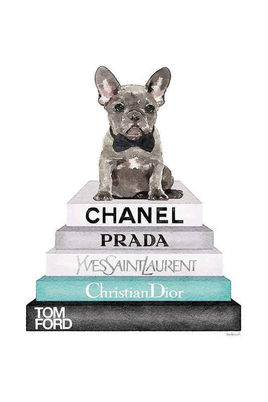 Teal Frenchie Bookstack White Modern Wood Framed Art Print with Double Matting by Greenwood, Amanda