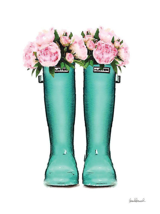 Teal Rain Boots with Peony White Modern Wood Framed Art Print with Double Matting by Greenwood, Amanda
