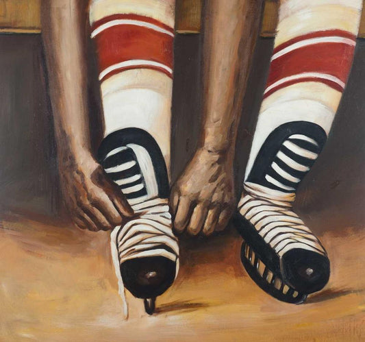 Hockey Player ties his Skates White Modern Wood Framed Art Print with Double Matting by Atelier B Art Studio