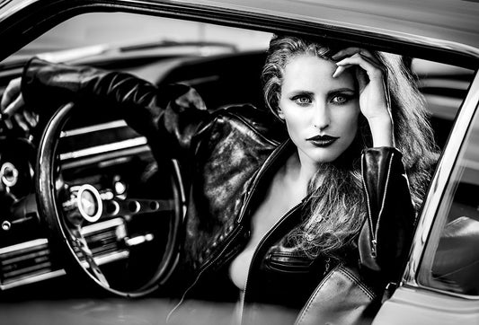 Waiting To Reverse My 69 Ford Mustang White Modern Wood Framed Art Print with Double Matting by Peter Muller Photography