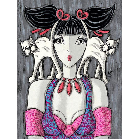 Deux chats-trois poissons Black Modern Wood Framed Art Print with Double Matting by MIROTA