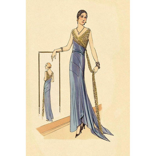 Evening Gown in Blue and Gold Black Modern Wood Framed Art Print with Double Matting by Vintage Fashion
