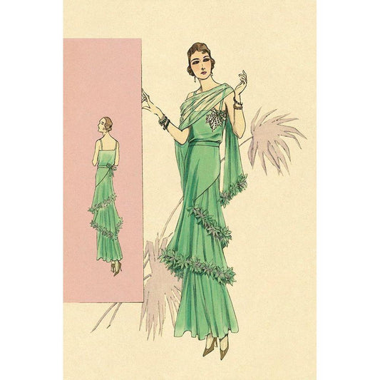 Playful Green Evening Gown Black Modern Wood Framed Art Print with Double Matting by Vintage Fashion