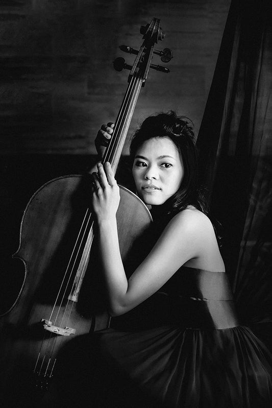 Female cellist White Modern Wood Framed Art Print with Double Matting by Yamamoto, Eiji