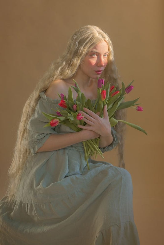 Lady With Flowers White Modern Wood Framed Art Print with Double Matting by Durisova, Michaela