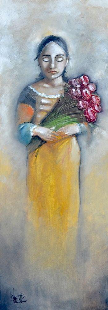 Woman with Roses White Modern Wood Framed Art Print with Double Matting by West, Ronald