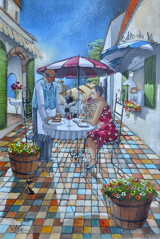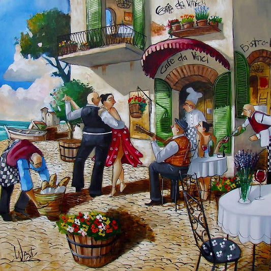 Dinner at Cafe da Vinci II White Modern Wood Framed Art Print with Double Matting by West, Ronald
