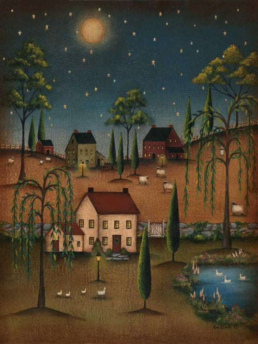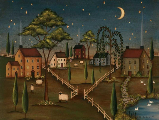 Village Full Moon Black Ornate Wood Framed Art Print with Double Matting by Lewis, Kim