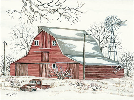 Winter Barn with Windmill White Modern Wood Framed Art Print with Double Matting by Jacobs, Cindy