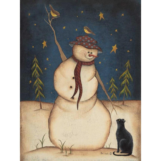 Snowman with Black Cat Black Modern Wood Framed Art Print by Lewis, Kim