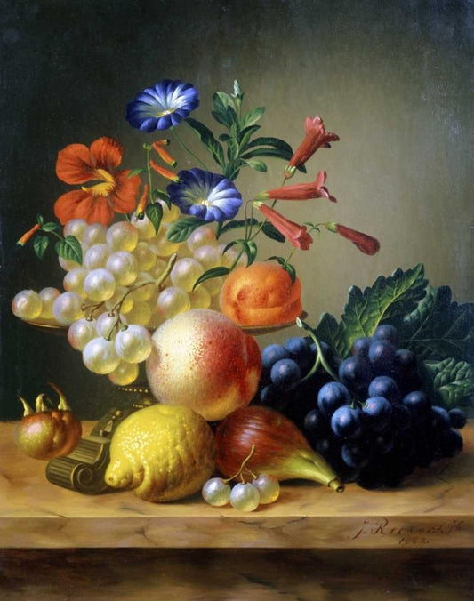 Grapes, a Lemon, a Fig and other Fruit White Modern Wood Framed Art Print with Double Matting by Reekers, Johannes