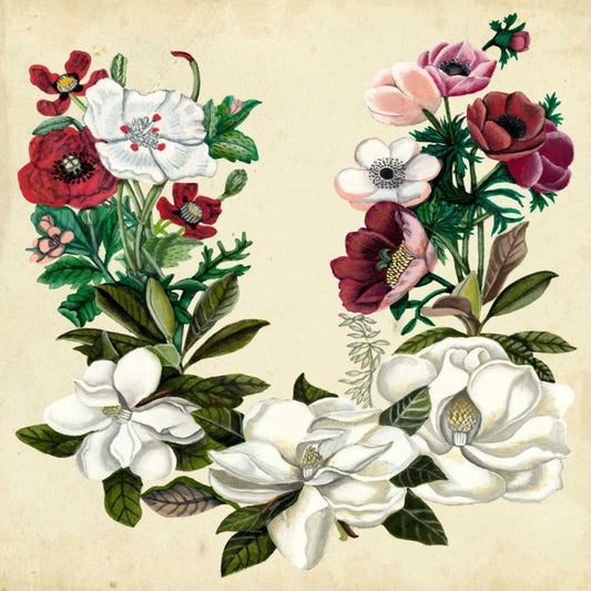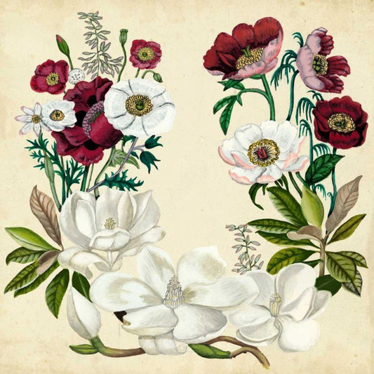 Magnolia and Poppy Wreath I White Modern Wood Framed Art Print with Double Matting by McCavitt, Naomi