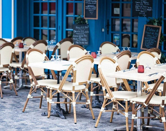 Blue Cafe White Modern Wood Framed Art Print with Double Matting by Price, Melanie Alexandra
