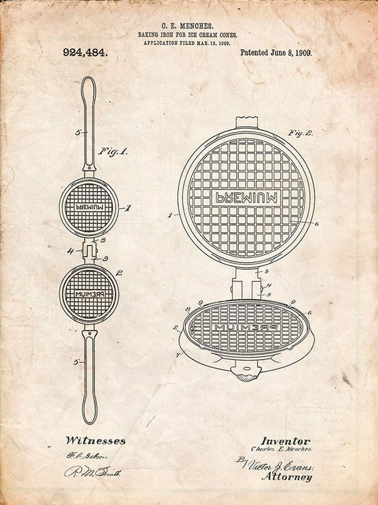 PP1130-Vintage Parchment Waffle Iron for Ice Cream Cones 1909 Patent Poster White Modern Wood Framed Art Print with Double Matting by Borders, Cole