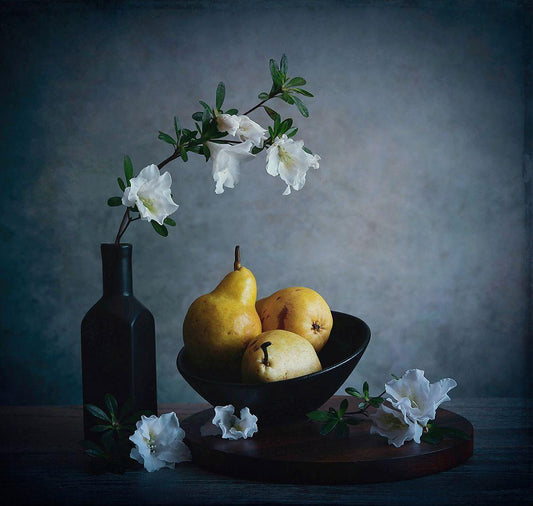 Pears A Flowers Black Ornate Wood Framed Art Print with Double Matting by Zhou, Fangping