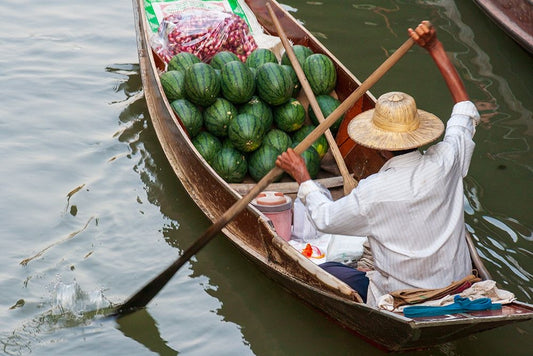 Damnoen Saduak Floating Market-Bangkok-Thailand-Man with a boatload of watermelons for sale Black Ornate Wood Framed Art Print with Double Matting by Haseltine, Tom