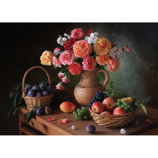 Still Life With Flowers And Autumn Fruits Black Modern Wood Framed Art Print with Double Matting by Skorokhod, Tatyana