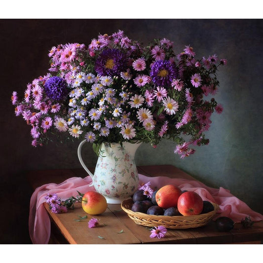 Still Life With A Bouquet Of Chrysanthemums And Fruits Black Modern Wood Framed Art Print with Double Matting by Skorokhod, Tatyana