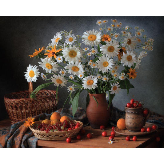 Still Life With A Bouquet Of Daisies Black Modern Wood Framed Art Print with Double Matting by Skorokhod, Tatyana