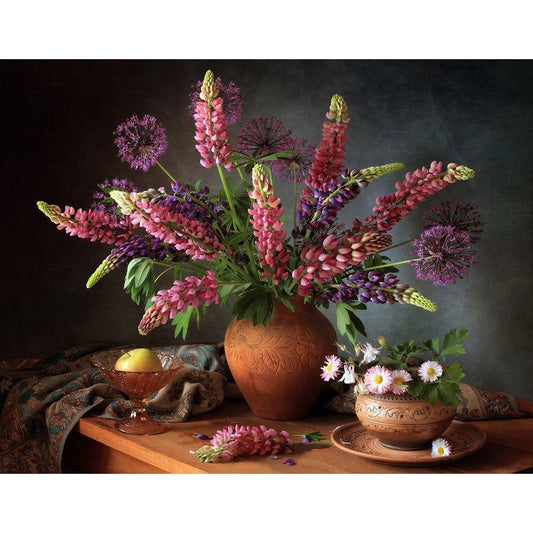 Still Life With A Bouquet Of Lupine Black Modern Wood Framed Art Print with Double Matting by Skorokhod, Tatyana