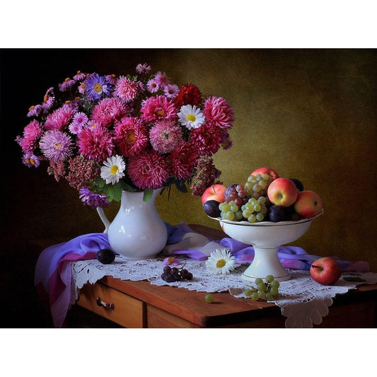 Still Life With A Bouquet Of Asters And Fruits Black Modern Wood Framed Art Print with Double Matting by Skorokhod, Tatyana