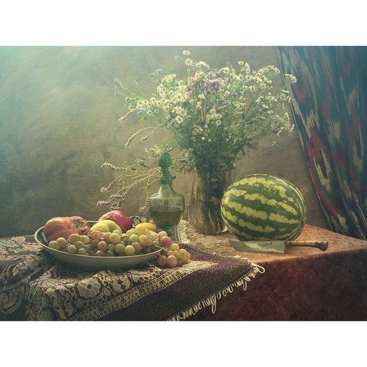 Still Life With Watermelon And Fruit Black Modern Wood Framed Art Print with Double Matting by Ustinagreen