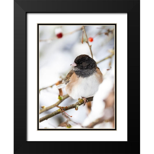 USA- Washington State- Sammamish. Junco on snow covered Crabapple tree Black Modern Wood Framed Art Print with Double Matting by Gulin, Darrell