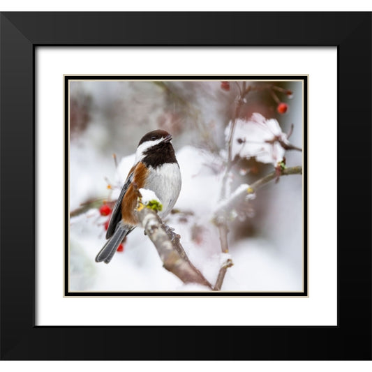 USA- Washington State- Sammamish. Chestnut Chickadee on snow covered Crabapple tree Black Modern Wood Framed Art Print with Double Matting by Gulin, Darrell