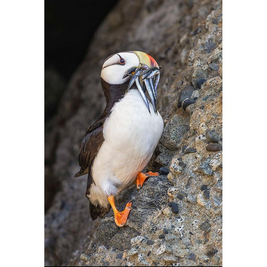 Horned puffin with needle fish in beak-Bird Island-Lake Clark National Park and Preserve-Alaska Black Modern Wood Framed Art Print with Double Matting by Jones, Adam