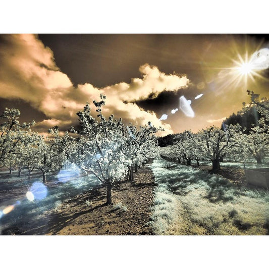 USA-Oregon-Columbia Gorge Infrared of light reflecting in spring apple orchard Black Modern Wood Framed Art Print with Double Matting by Eggers, Terry
