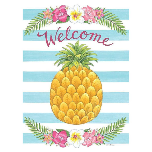 Welcome Tropical Pineapple Black Modern Wood Framed Art Print with Double Matting by Strain, Deb