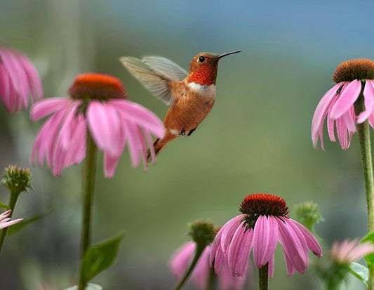 Rufous Hummingbird among purple Cornflowers White Modern Wood Framed Art Print with Double Matting by Fitzharris, Tim