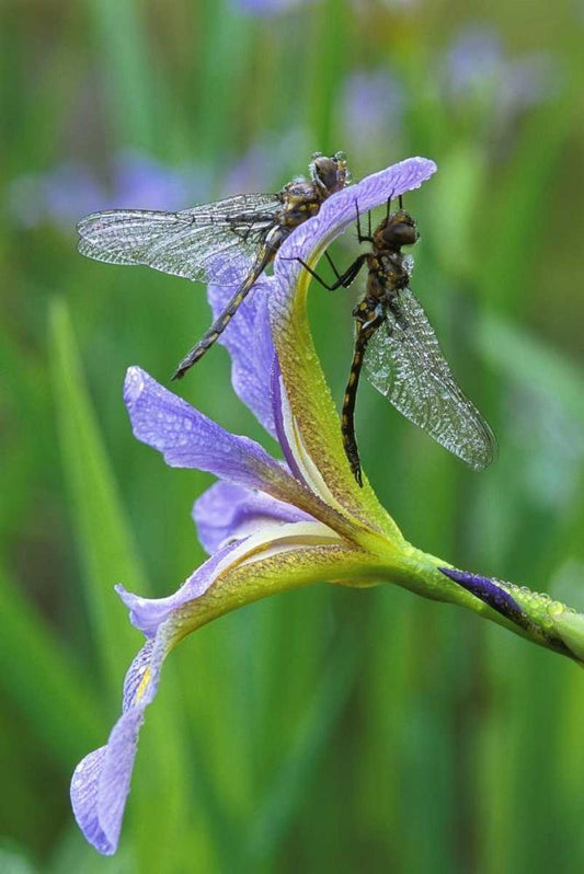 USA, Pennsylvania Two dragonflies on iris flower White Modern Wood Framed Art Print with Double Matting by Rotenberg, Nancy
