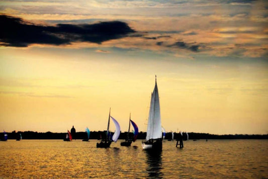 Shrimpers at Sunrise I White Modern Wood Framed Art Print with Double Matting by Hausenflock, Alan