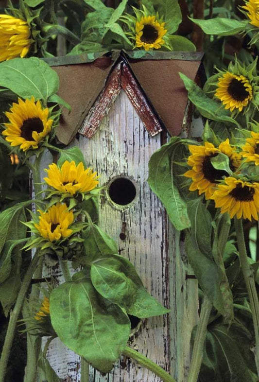 Birdhouse and Sunflowers in garden White Modern Wood Framed Art Print with Double Matting by Rotenberg, Nancy