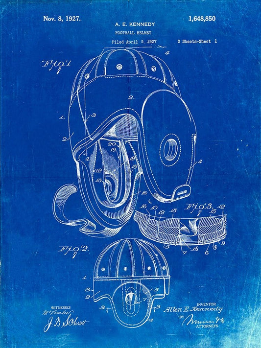 PP73-Faded Blueprint Football Leather Helmet 1927 Patent Poster White Modern Wood Framed Art Print with Double Matting by Borders, Cole