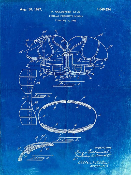 PP219-Faded Blueprint Football Shoulder Pads 1925 Patent Poster White Modern Wood Framed Art Print with Double Matting by Borders, Cole