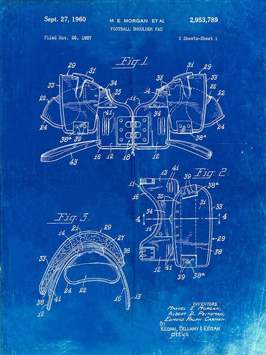 PP504-Faded Blueprint Vintage Football Shoulder Pads Patent Poster White Modern Wood Framed Art Print with Double Matting by Borders, Cole