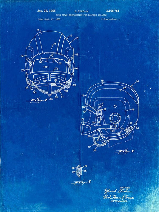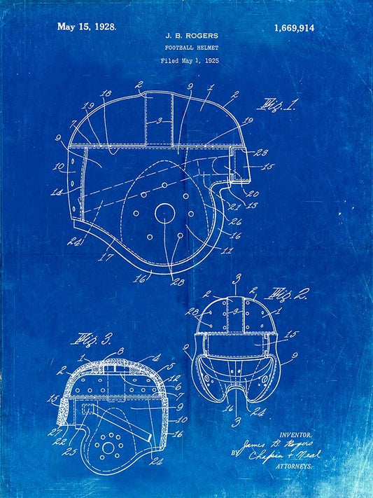 PP218-Faded Blueprint Football Helmet 1925 Patent Poster White Modern Wood Framed Art Print with Double Matting by Borders, Cole