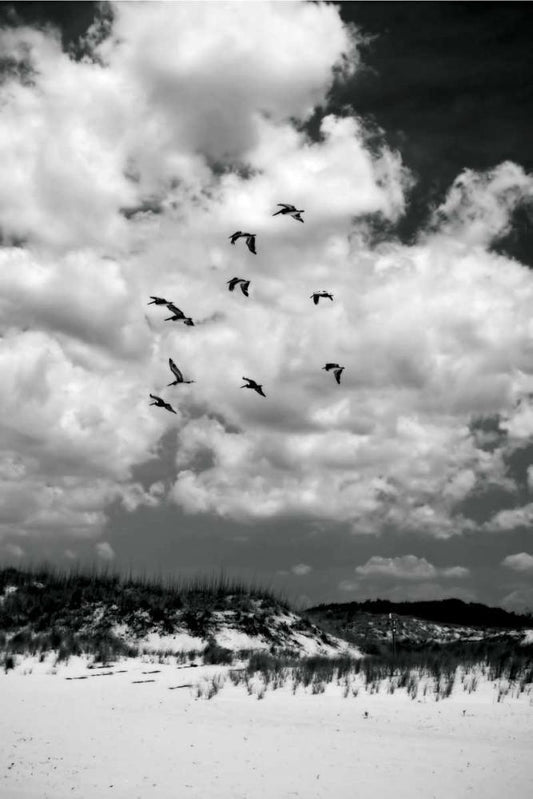 Pelicans over Dunes V White Modern Wood Framed Art Print with Double Matting by Hausenflock, Alan