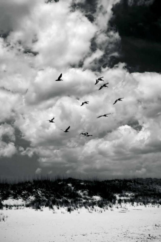 Pelicans over Dunes VI White Modern Wood Framed Art Print with Double Matting by Hausenflock, Alan