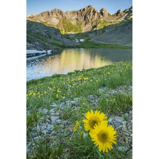 CO, San Juan Mts Lake and alpine sunflowers Black Modern Wood Framed Art Print by Illg, Cathy and Gordon